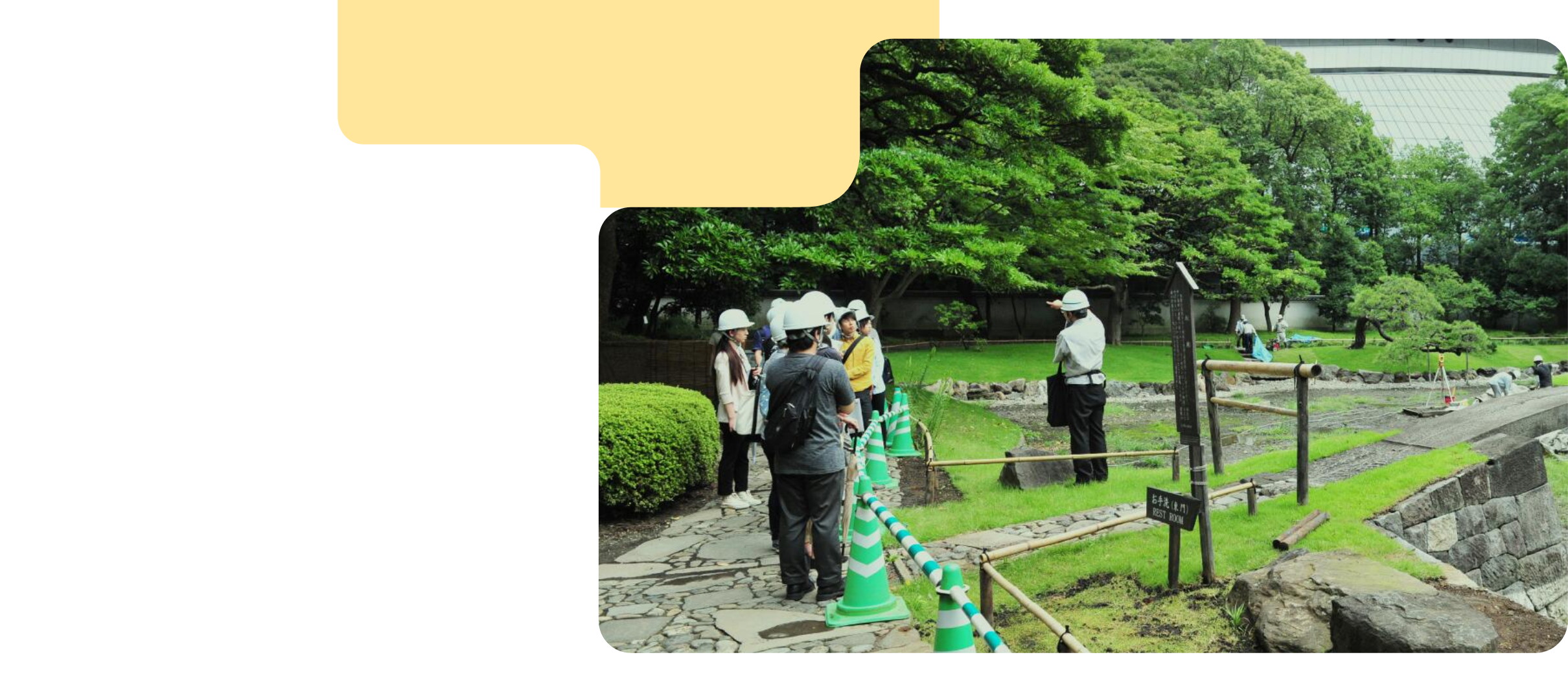 都の職員の仕事は、修復工事の計画から実施まで、全ての行程をマネジメントすること。「円月橋」の修復工事を例にとると、予算要求、現地測量や破損状況の基礎調査、修復方針の作成、文化財保護法に基づく文化庁との協議、解体工事の設計積算や工事監督、工事見学会の開催や事業パンフレットの作成など一連の業務を担当者(造園職)が担っている。また、庭園の修復事業は、専門的な見地から慎重に検討を加えながら作業を進めるため、多くの人の協力がなくては成し得ない仕事だ。考古学や歴史学、建築学などの専門家や、文化庁、教育庁の職員などを含めたメンバーで行う専門分科会は、修復方針や工事の進め方を定めるための重要な場となっている。また専門家の先生に現場へ足を運んでいただき随時指導を受けることで、より的確に修復工事が進められている。先生方や関係者と意見交換を行い、事業に反映させる調整力や技術力が求められる仕事である。