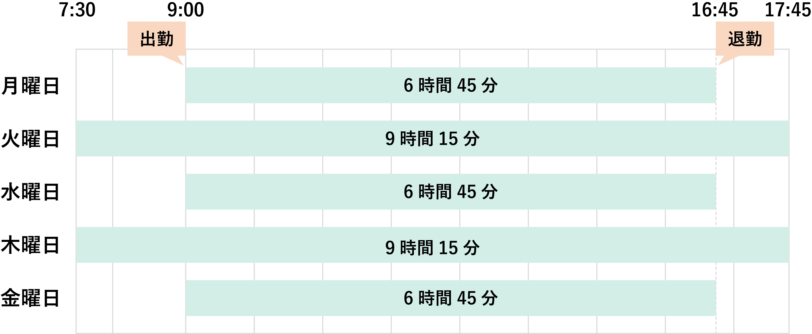 4週間を単位とした期間の中で合計155時間となるように、1日の正規の勤務時間を伸び縮みさせることができる制度です。