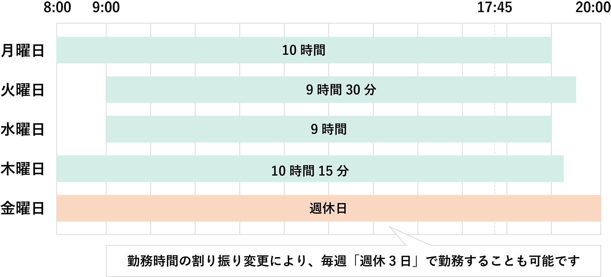 例えば、繁忙が予想される期間の終業時刻を遅く設定し“ワーク”に集中、その後の落ち着いた期間は短い勤務時間を設定し時間外の“ライフ”を充実、といった業務の繁閑に応じたメリハリのある働き方ができます。また、フレックスタイム制を活用して、週休3日で働くこともできます。