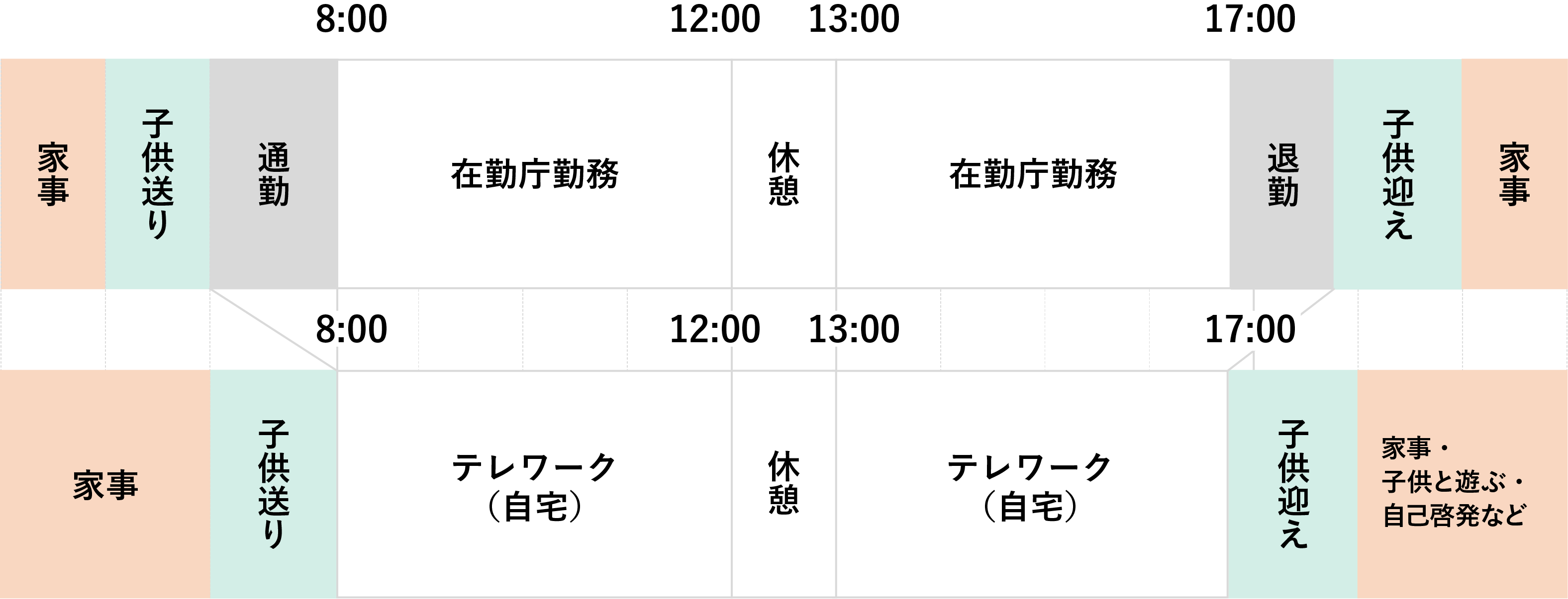 <1日のスケジュール例>移動時間を削減し、空いた時間を育児や家事、自己啓発などに活用。